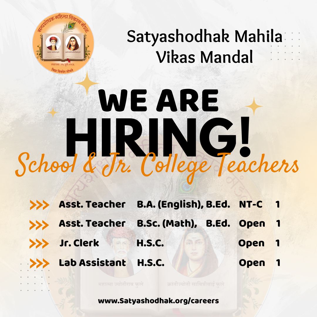 All new school teacher vacancies, junior college vacancies, lab assistant jobs, and clerical posts are updated on our official Careers Page: https://satyashodhak.org/careers/